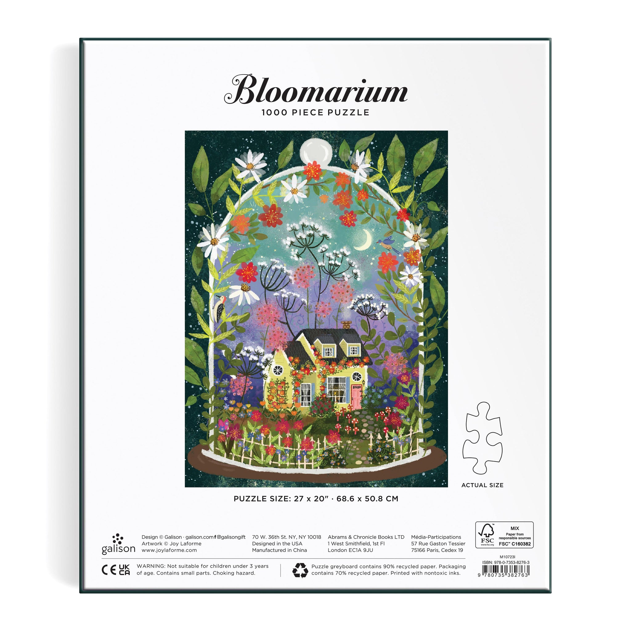 Joy Laforme's Bloomarium 1000 Piece Puzzle is a charming jigsaw puzzle that captures the essence of a tranquil and inviting cottage nestled within a terrarium flourishing with vibrant flowers. Delight in the array of colourful plants and daisies, beautifully illuminated by the moonlit sky, adorning the lovely little cottage.