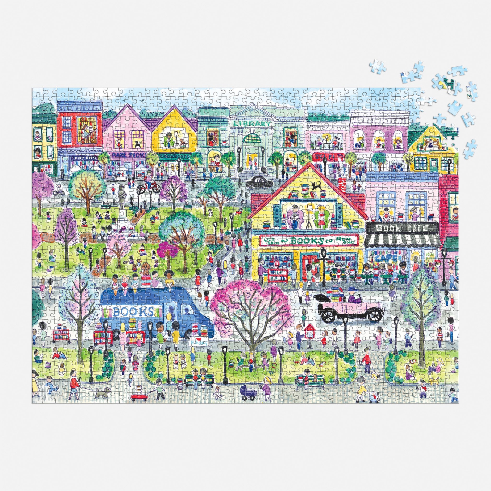 Explore a vibrant literary haven with Michael Storrings' whimsical illustration in this 1000-piece puzzle. The intricate scene depicts a charming town brimming with bookshops, bustling streets filled with book enthusiasts, and creative touches like mobile book vendors that celebrate reading culture. Every corner reveals new details—from engaged readers scattered throughout parks and public spaces to vehicles laden with literary treasures. Perfect for bibliophiles and puzzle aficionados, this composition captures the joy and community spirit of a book lover's paradise.