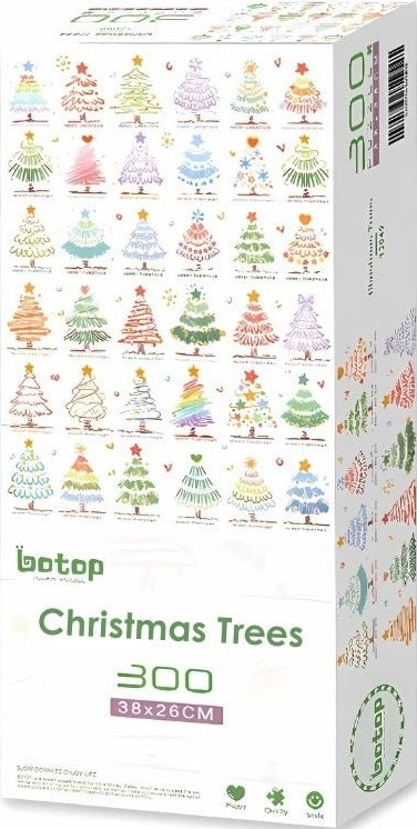 Celebrate the festive season with this cheerful 300-piece puzzle featuring a collection of hand-drawn Christmas trees. Each tree is uniquely decorated with bright colours, stars, hearts, and playful patterns. A fun, light-hearted puzzle that adds joy to any Christmas setting.