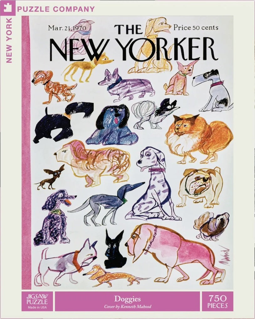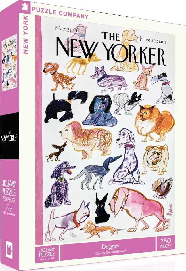Delight in the whimsical world of dogs with the "Doggies" 750-Piece Jigsaw Puzzle, inspired by the March 21, 1970, cover of The New Yorker magazine. Illustrated by celebrated cartoonist Kenneth Mahood, this charming artwork features a delightful array of dog breeds, from poodles and bulldogs to dalmatians and collies, all captured in a playful and humorous style. Set against a crisp white background, the design highlights the unique personalities of each pup, making it an irresistible choice for dog lovers and puzzle enthusiasts alike.