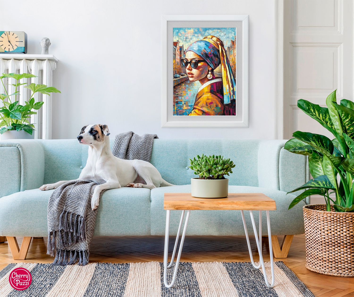 In a modern twist, a girl with a pearl earring, dons stylish sunglasses. This playful rendition blends timeless elegance with contemporary flair, creating a unique fusion of past and present.