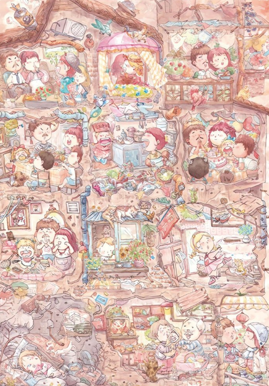 Step into a whimsical pastel village, where small, charming houses cluster together in a peaceful community. With soft pinks and light browns, this vintage-inspired scene captures everyday life through playful characters, flowers, and quaint details, evoking a nostalgic, dreamlike