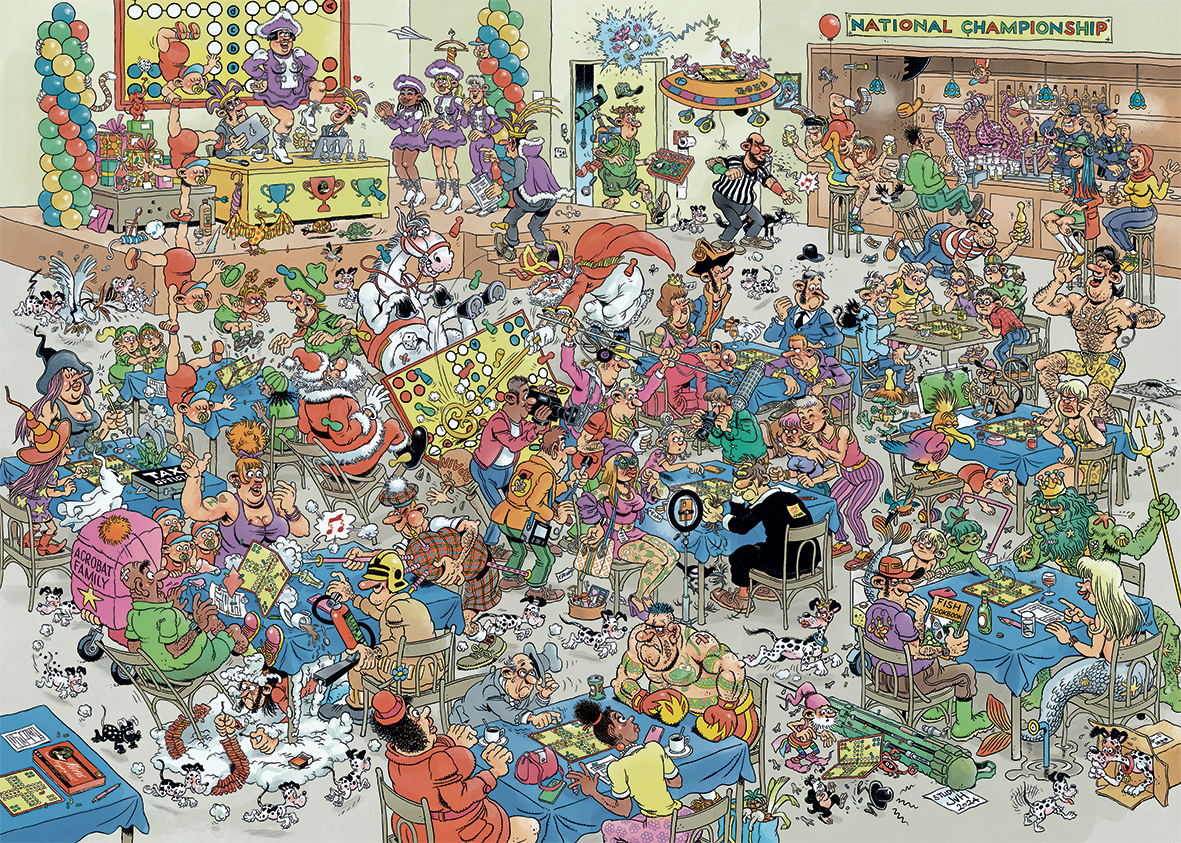 'Ludo Battle' is the title of this Jan van Haasteren 1000 piece jigsaw puzzle and, as with all of his illustrations, you are sure to find this puzzle extremely enjoyable while laughing at all of the individual illustrations. But as with every Jan van Haasteren puzzle, not everything is going to be plan with characters and situations that many of us would all find all too familiar.