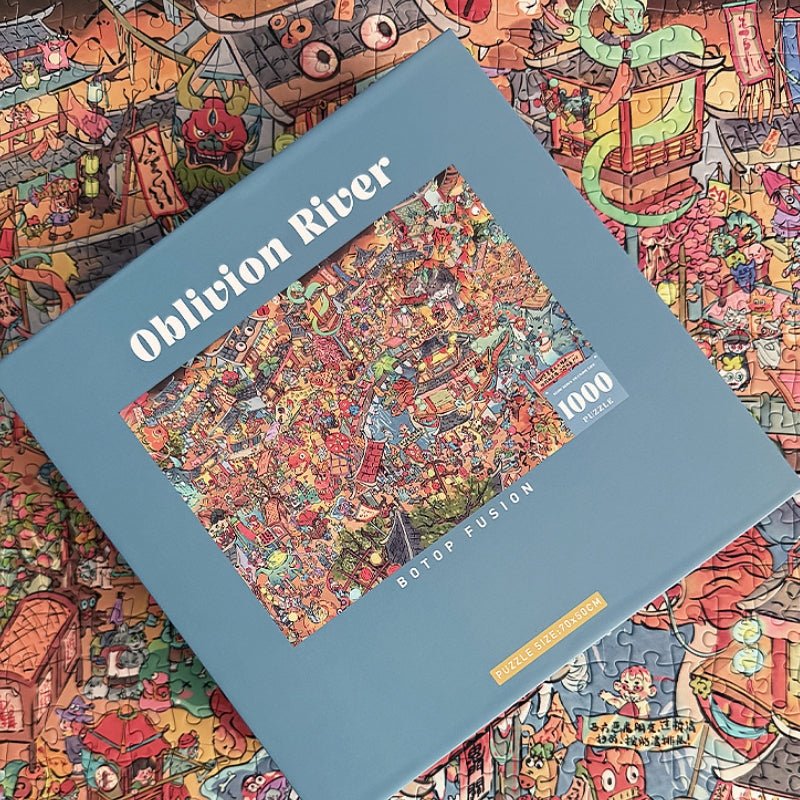 Dive into a world of colour, chaos, and creativity with the Oblivion River Velvet Jigsaw Puzzle by Botop. This highly detailed 1000-piece puzzle captures a lively fantasy marketplace bustling with whimsical characters, intricate buildings, and mythical creatures all flowing along a vibrant river scene. Every inch of the artwork is packed with surprises, making it a joyful and rewarding challenge for puzzle lovers who enjoy uncovering new details with every piece.