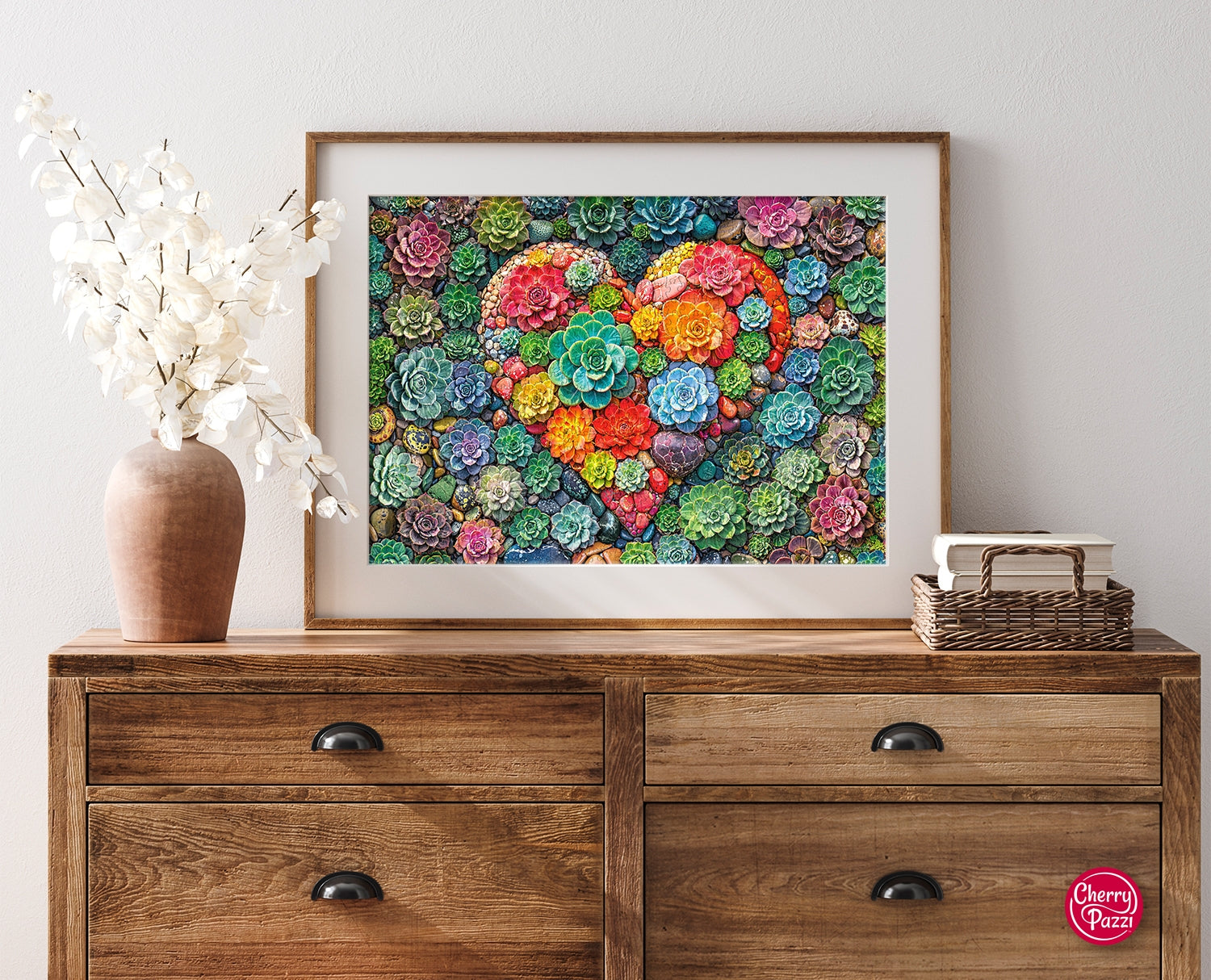 Look at this heart made entirely of vibrant, colourful succulents. The succulents are tightly nestled together, forming a perfect shape. The natural symmetry and the rich tones represent a love that is both resilient and tender, enduring just like these drought-resistant plants. It's the shape of love's strength and beauty.
